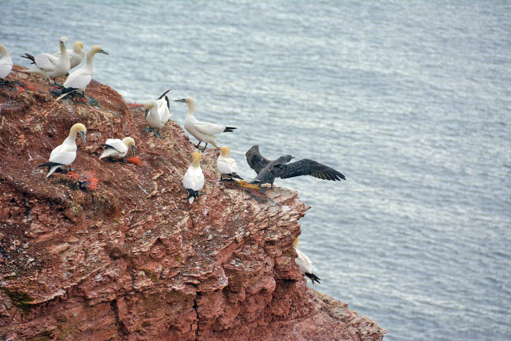 Głuptaki (Basstölpel) pobudowały gniazda na klifie w niedostępnych, ale łatwych do obserwacji miejscach. Szybowanie w unoszącym się powietrzu sprawia im wyraźną przyjemność. Wtedu pozują do naszych zdjęć. Młode, o ciemnym ubarwieniu z ciekawym deseniem tylko próbują skrzydeł.